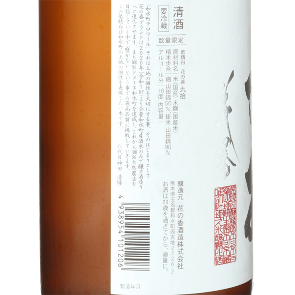 「和水町テロワール」それは土地の個性を大切にする事。そのはじまりとして花の香ブランドは2020年より全量和水町産酒米のみで醸す酒造りへと進化させます。これから100%自然農法を目指していく中で、100%ドメーヌ和水町を達成し、磨かないという事での最高品質に挑戦していきます。低精白と1401酵母で土地の個性を表現した1本を是非味わって下さい。蔵紹介