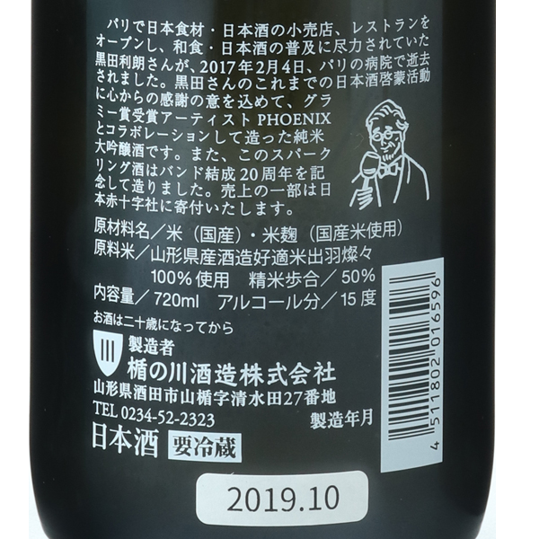 メンバーが日本酒好きというフランス発のグラミー賞受賞ロックバンドPHOENIXと楯野川酒造のコラボレーション酒。第1弾、第2弾に続く第3弾はPHOENIXバンド結成20周年を記念した純米大吟醸のスパークリング日本酒です。ガスを添加せず、自然発酵の力だけで発泡感を実現させました。穏やかで 心地よい発泡感 と、絶妙に調和がとれた甘味と酸味が特長です。またこのお酒の売上の一部は、パリで和食・日本酒の普及に尽力し続けた黒田利朗さんに哀悼の意を表し、日本赤十字社に寄付されます。