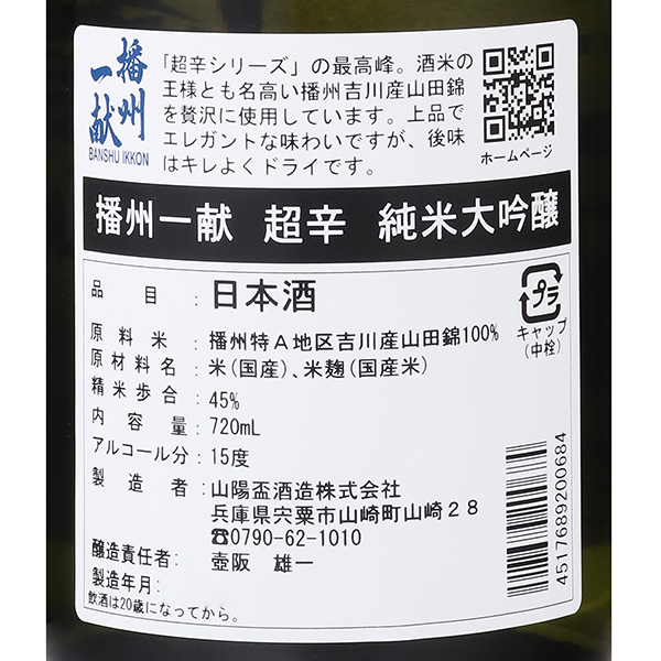 播州一献フラッグシップ「超辛シリーズ」のひとつ、一番やわらかな辛口が、この「純米大吟醸」です。播州吉川産山田錦という国内最高品質ともいわれる山田錦を贅沢に使用しています。メロンの様な香りと上品でエレガントな味わい。口に入れると幾重にも折り重なる旨味を感じ、繊細で重厚な余韻を感じ、キレよく、ドライなお酒です。蔵紹介