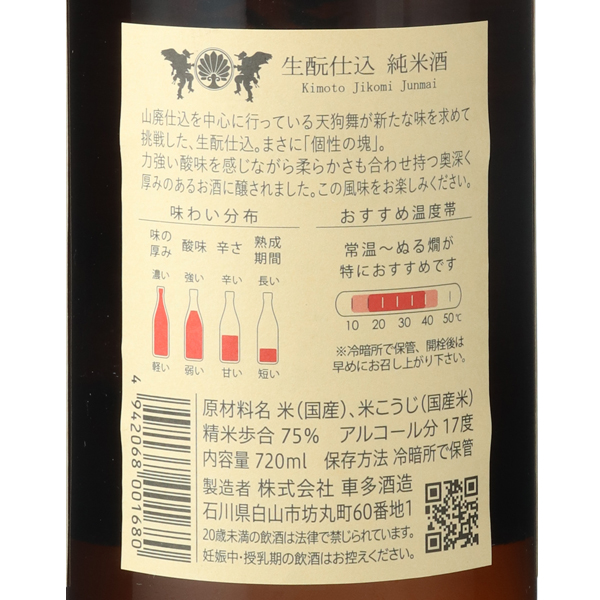 力強い酸味を感じながら柔らかさも合わせ持つ、奥深く厚みのあるお酒に醸されました。山廃仕込を中心に行っている天狗舞が新たな味を求めて挑戦した生もと仕込、個性の塊を是非お楽しみ下さい。常温〜ぬる燗でお楽しみ頂くのが特におすすめです。蔵紹介