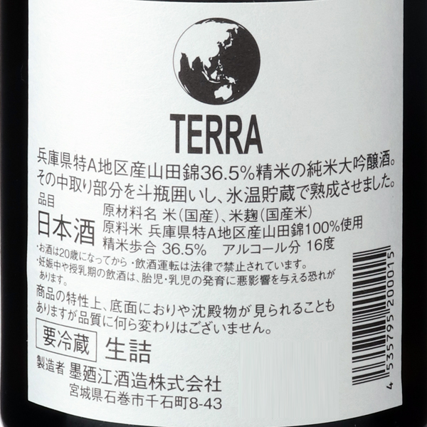特A山田錦を贅沢に36.5%まで磨いて醸した純米大吟醸を直汲斗瓶取りし、じっくりと熟成をしました。氷温での管理が徹底され、やや若さも感じられる綺麗な仕上がりです。落ち着いた清涼感のある香りに、シャープな飲み口。ゆっくりと味わうとジワリと旨みが顔を出します。後口はわずかにほろ苦い余韻を感じ、このお酒をより味わい深いものにしています。terraとはラテン語で大地や地球を意味します。【営業部大久保コメント】この価格帯には珍しいしっかりとドライな仕上がりです。純米大吟醸クラスになると甘めのお酒が多くなりますが、TERRAは爽やかなアタックから始まり、引き締まったキレのある味わい。お寿司やお刺身などの魚料理をはじめ、少し贅沢なお料理に合わせてぜひお楽しみください。