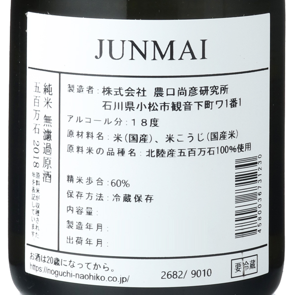 農口尚彦研究所 純米 無濾過原酒 火入れ 2018