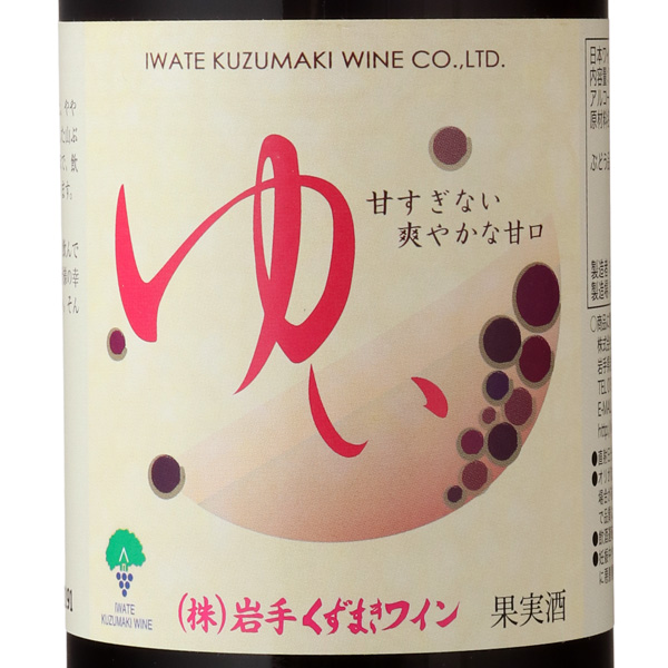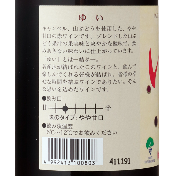 葛巻町、八幡平町、九戸村、野田村、洋野村の岩手県北産やまぶどうを贅沢に使用した、やや甘口のワインです。山ぶどうのコクときれいな酸味が甘さを引き締め、飲み飽きしない飲み口に仕上がっています。「ゆい」とは「結ぶ」を意味し、各産地が結ばれたこのワインを飲んで楽しんでくれる皆様が結ばれ、皆様の幸せな時間を結ぶワインでありたいという思いが込められています。蔵紹介