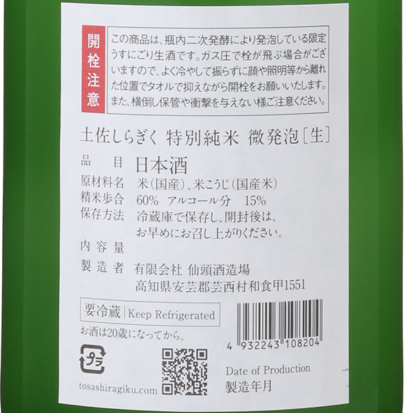 瓶内二次発酵により生まれたナチュラルできめ細やかな泡が、シュワッと弾けるうすにごり微発泡の新酒です。フルーティーで軽快な味わいと、滑らかな舌触り、シュワシュワとしたガス感をお楽しみ下さい。爽やかな後口は、ローストチキン、サーモンとアボカドのタルタルの料理などにおすすめです。注意事項