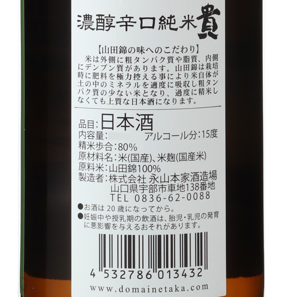 Terroir(テロワール)を求めて1888年(明治21年)山口県宇部市に創立。今の5代目、永山貴博氏が2002年に純米酒の可能性を追求する銘柄「貴」を立ち上げました。世界の醸造酒としてゆるぎない存在である、ワインの生産者から大いに感銘を受けた貴博氏は、地元で自らも稲作をしている二俣瀬の田んぼに対する敬意の念を抱いてゆきます。2019年には本格的に農業法人を設立し酒米づくりに取り組んでいます。ミネラル分豊富な仕込水の特性も活かした、クリアな旨辛口の味わいが人々の心を捉えています。