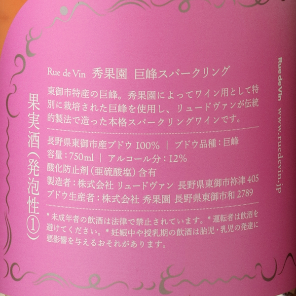 通常、巨峰から造られるワインは上質なものは少なく、むしろ甘さを添加して味わいをごまかさなくてはならない傾向にあります。しかし東御市を代表する巨峰農家 秀果園の栽培技術とリュードヴァンの醸造技術の融合で、上質なスパークリングワインが実現しました。味わいはほんのりとした膨らみのある辛口。巨峰由来のネガティブな香りはほとんど存在せず、上質なスパークリングワインとしてワインファンを驚かせています。注意事項
