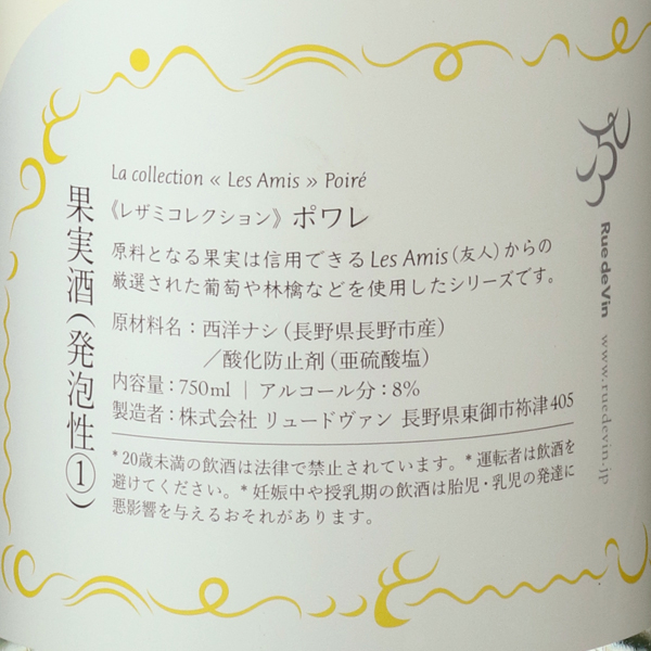 西洋梨を原料にシャンパン製法で醸造した発泡性果実酒です。林檎を原料とした発泡性果実酒のシードルの言わば西洋梨版。醗酵によって生成される香りは上品で西洋梨ならではのもの。瓶内二次醗酵によるオリ(酵母)を取り除き、さらに味わいの調整をすることで、香り、味わいのみならず見た目も大変美しく仕上がっています。《レザミコレクション》やまさ農園 ポワレ