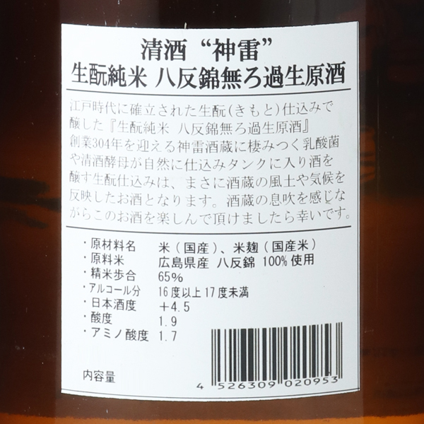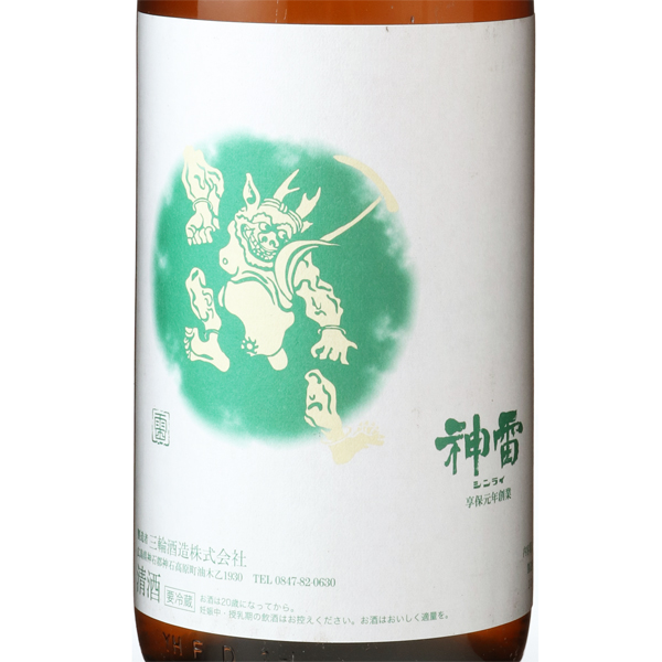 課せられた使命は、先人たちが築き上げた清酒という文化を伝承し、生活の潤いを、人生の喜びと悲しみを、共に味わっていくこと1716年創業。酒銘の神雷の由来はその昔雷が酒造蔵に落ちたが、大過なかったこと、また神石にあやかった事から。ちなみに稲妻は稲の妻と書くとおり、豊かな恵みをもたらす象徴であることから、大変縁起の良い名前です。酒蔵は中国山脈の山あい、標高500mに位置し、冬場は氷点下を記録します。さらに夏場も涼しいため、お酒の仕込、貯蔵共に大変適した環境が整っています。また、裏山の井戸から軟水、蔵の地下からは中硬水が得られ、用途によって使い分けが出来るのも特徴となっています。