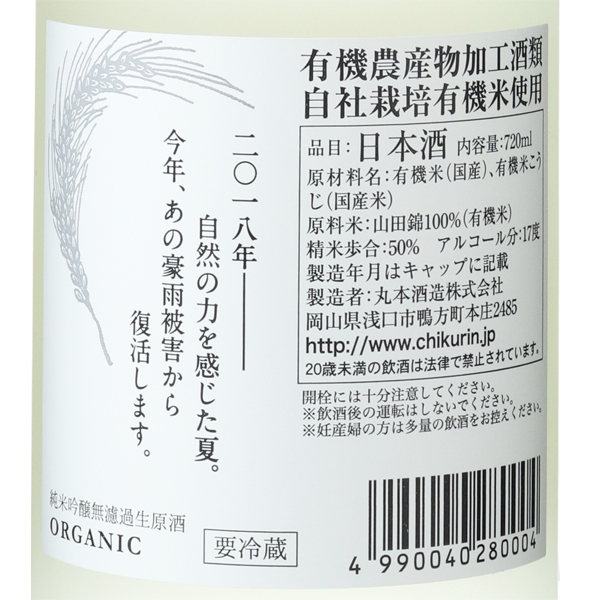 日本一帯の豪雨被害復興を支援するため発発足した「HASHIWATASHIプロジェクト」により生まれたこのお酒は、2018年夏に起きた西日本豪雨時に被災した有機圃場で育てた有機栽培米を100%使用して造られています。2018年に作付けしていた米はすべて有機ではなくなり、収量は通常より7割減。2019年度は、幸いにも有機認定を復活させることができ、以前と同じくらい収量に戻すことに成功しました。商品名のCHIKURIN Rebornとは、有機圃場復活と被災された皆様の復興=Rebornを意味しています。このような経緯もあり、有機のお酒で初めての試み、無濾過生原酒で出すこととなりました。若々しいマスカットを思わせる甘酸っぱい香りに、軽く爽やかに広がる米のうまみが広がりますが、最後はドライにスッキリとキレる味わいです。