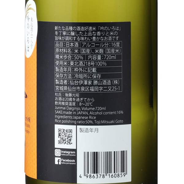 仙台で現存する唯一の伊達家御用蔵元禄元年、1688年に伊達政宗公を藩祖とする伊達家六十二万石の城下町仙台にて創業。その後、320年以上の間酒造りを続けている由緒ある酒蔵です。蔵のある地域は、お米を中心とした穀倉地帯で、泉ケ岳から湧き出る水は、勝山の仕込み水として深井戸より汲み上げ使用しています。水質は酒造りに適した軟水で、美人成分の天然シリカを多く含む、柔らかくキレイな水質となっています。勝山酒造のお酒は純米酒のみに特化しており、1週間にタンク1本の贅沢な仕込を行っています。様々な料理との相性が良く、多様な飲み方を楽しんで頂けます。