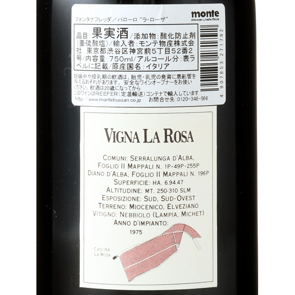 セッラルンガ・ダルバに位置する畑ラ・ローザは、フォンタナフレッダ社が所有する畑の中でも非常に素晴らしい畑の一つ。アリエ産オークの樽で1年、その後中樽で1年熟成され、さらに1年間の瓶内熟成を経てリリースされます。腐葉土、キノコ、梅、ドライチェリー、ドライローズなど非常にエレガントな熟成香。味わいも一体感があり、極上のブルゴーニュを思わせる香りと味わい。わずかだけ使用しているバリックがすばらしい働きをしています。蔵紹介