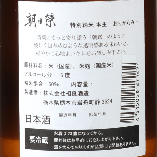 朝日榮は朝もやの中を昇る清澄な朝日のように、喜びと繁栄を願い名付けられました。その朝日榮の由来である朝もやをイメージしたおりがらみです。栃木県産あさひの夢を60%精米し、やわらかく透明感のある味わいと、優しく上品なキレのある味わいを表現しました。蔵紹介