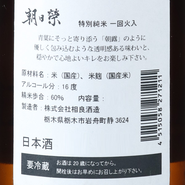 青葉にそっと寄り添う朝露のように透明感のある日本酒天保2年、1831年創業。現在では若くして蔵元杜氏となった相良沙奈恵氏を中心に酒造りが行われています。沙奈恵氏は東京農大卒業後、他の酒蔵で修業を積み、蔵に戻った翌年から杜氏の重責を担うことになりました。普通酒主体だった酒造りから吟醸造りへ大きく方向転換をし、日々研鑽を積む女性杜氏が醸すそのお酒は年々進化し続けています。代表銘柄「朝日榮」では、みずみずしい透明感と後味のキレが表現されており、食事にそっと寄り添ってくれるお酒です。