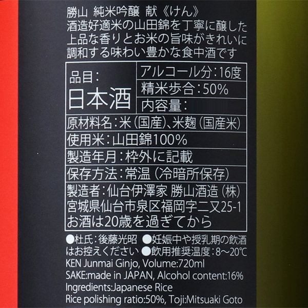仙台で現存する唯一の伊達家御用蔵元禄元年、1688年に伊達政宗公を藩祖とする伊達家六十二万石の城下町仙台にて創業。その後、320年以上の間酒造りを続けている由緒ある酒蔵です。蔵のある地域は、お米を中心とした穀倉地帯で、泉ケ岳から湧き出る水は、勝山の仕込み水として深井戸より汲み上げ使用しています。水質は酒造りに適した軟水で、美人成分の天然シリカを多く含む、柔らかくキレイな水質となっています。勝山酒造のお酒は純米酒のみに特化しており、1週間にタンク1本の贅沢な仕込を行っています。様々な料理との相性が良く、多様な飲み方を楽しんで頂けます。
