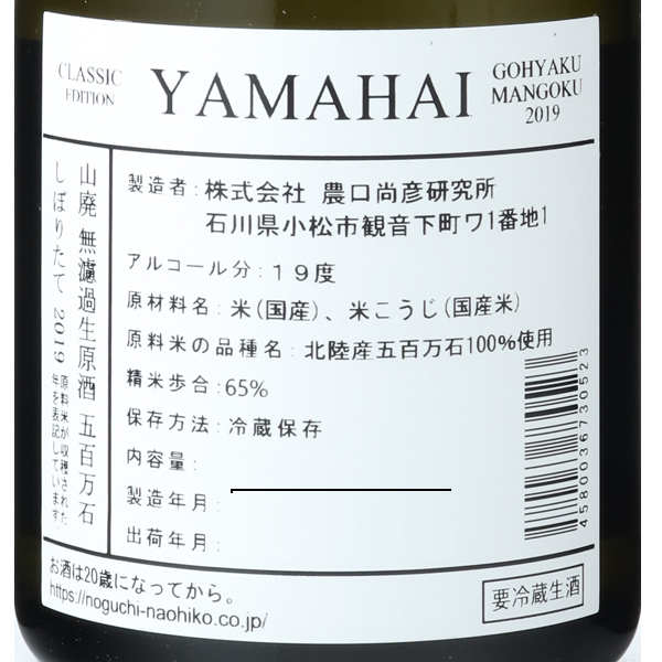 農口尚彦研究所 山廃 五百万石 2019 しぼりたて *クール便のみ