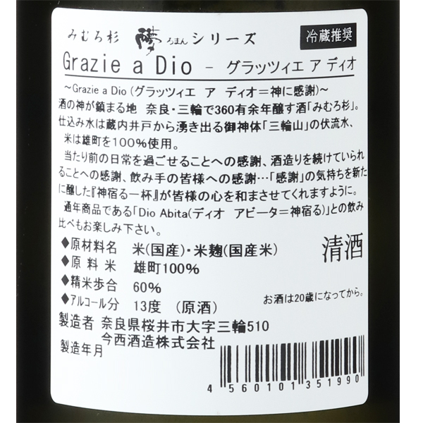 Grazie a Dioはイタリア語で神に感謝という意味です。様々な感謝の気持ちを込めてリリースされました。アルコール度数13度の原酒で、香りはフレッシュでラムネ様の吟醸香。雄町米ならではのパワフルな果実感あるジューシーさと旨味、フィニッシュは綺麗な酸でまとまっていきます。ぜひ通年商品である「Dio Abita」との飲み比べもお楽しみください。蔵紹介