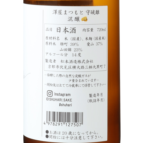 原料に勝る技術は無し!1791年創業。京都市伏見の歴史ある酒蔵で、赤レンガ蔵と八角形の煙突が印象的な酒造蔵は、近代化産業遺産に指定されています。澤屋まつもとのコンセプトは、守破離 (しゅはり) 。澤屋まつもとの伝統を守ること。伝統を破り、他で学んだことを実践すること。守と破を大切に、そこから離れて新たな価値観を見出すこと。京都の酒蔵として、京都の水、良質な米の旨みを表現。透明感、旨み、爽やかさ、シンプルな中に、エネルギーを感じられるお酒です。
