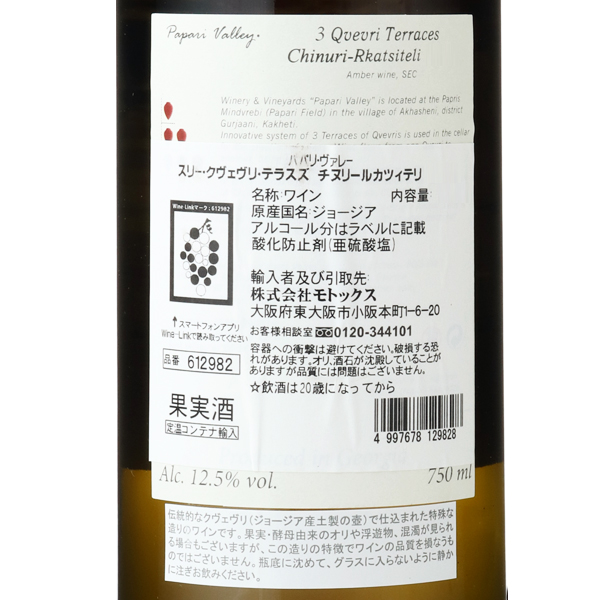 温度管理をしながら醸造されることにより、クリーンな味わいに仕上がっています。ジョージアのオレンジを初めて飲む方にもおすすめです。2015年が初ヴィンテージと若い生産者ながら、世界中のワイン関係者の注目を集めています。フローラルな香りが親しみやすく、リンゴやメロンなどの豊かな果実味に華やかなフローラルのアロマ。プラム、ドライフルーツなどの芳醇な風味がタンニンとよいバランスを生み出し、美しく長い余韻が魅力。使用品種:チヌリ、ルカツィテリ