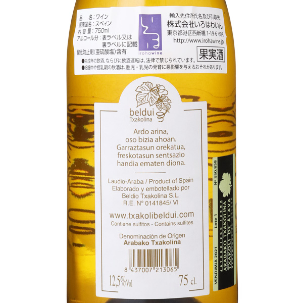 山の頂上にあるワイナリーで、雨量の少ない山側「アラバ」のチャコリの中でも特に雨が少ない恵まれた場所です。そのため果実の風味が強くなっており、海を感じるミネラルやきれいな酸、余韻の爽やかな苦みが感じられます。微かな発泡感が感じられるフレッシュなチャコリ。爽やかな果実味と最後にほんのりと残る苦みが特徴的です。海の風と陽をたっぷりと浴び、魚介類との相性は抜群です。黄金色。クリアで際立った濃縮感があり、白い果実とトロピカルフルーツの香りが際立ちます。乳製品、フレッシュな花の香りで、酸味がよく溶け込み、リンゴの風味、ハーブの香りが感じられます。