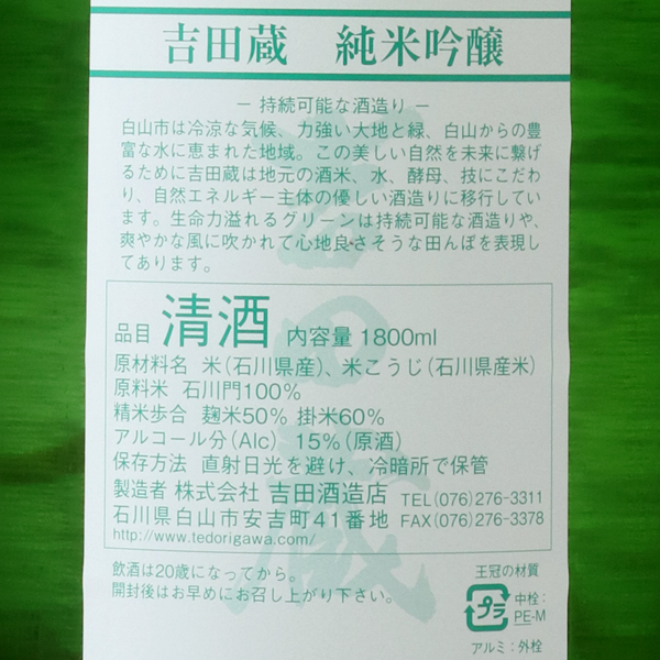 吉田蔵シリーズは地酒本来の姿を追求し、新たに生まれ変わりました!「地酒本来の姿に戻る」「自然のサイクルから外れない持続可能な酒造り」この2つが新生「吉田蔵シリーズ」のコンセプトです。地元にこだわり、仕込み水は白山百年水、同じ水で育った地元酒米の石川門、金沢酵母で醸しています。ラベルの生命力溢れるグリーンは壮大な田園風景や持続可能な世界観、そして青リンゴのようなフレッシュさを表現しています。蔵紹介