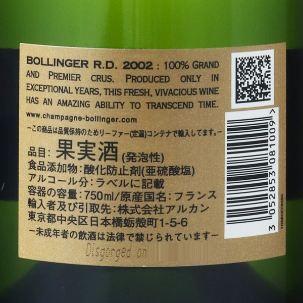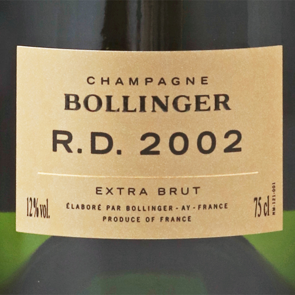 ボランジェのヴィンテージシャンパーニュの中でも、特に秀逸なものだけがR.D.となります。2002年は、過去10年間の中で最も将来が楽しみなヴィンテージのひとつ。通常の3倍以上の熟成期間を設け、滓引き後数ヶ月でリリースすることで、際立ったフレッシュさと熟成による重厚感の両方が感じられるのです。熟したフルーツやコンポートにしたマルメロの香りに、控えめなハチミツが感じられます。その後、トーストやカカオ香が感じられ、八角やナツメグの香りへと移っていきます。アタックは肉感的で力強く、バランスの良い持続性があります。ミネラル感のあるフィニッシュで、レモンの風味が心地よい苦みを感じさせます。