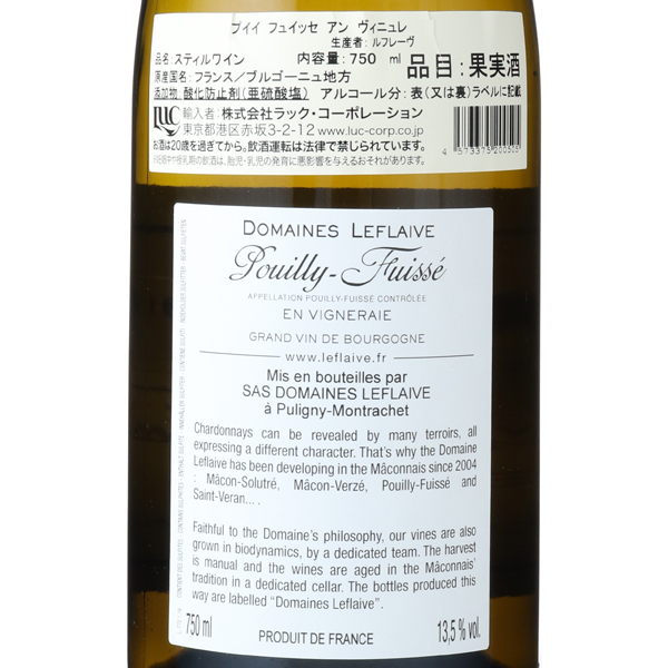 ルフレーヴがプイィ・フュイッセで手に入れた、新しい畑で獲れたブドウから造りました。畑は南南東向きの斜面に位置し、水はけが良く根が地中深くまで伸びるため、ブドウにミネラルの特徴が与えられています。土壌は粘土石灰質で、ソリュトレの岩周辺の12の区画からアッサンブラージュしました。糖と酸のバランスに優れた、素晴らしい辛口白ワインです。蔵紹介