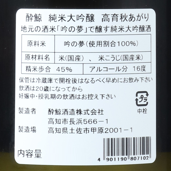 高知オリジナル酒米「吟の夢」で醸した秋限定の純米大吟醸秋と言えば食欲の秋、秋刀魚や松茸など美味しい食材に溢れています。酔鯨 純米吟醸 高育54号の心地よい酸味を残しながら、秋の味覚に合うように味、香りともにリッチなお酒に仕上げています。香味が円熟し旨みが乗った大吟醸酒ならではの吟醸香と、酔鯨らしいしっかりとした酸味を感じられるのが特徴です。