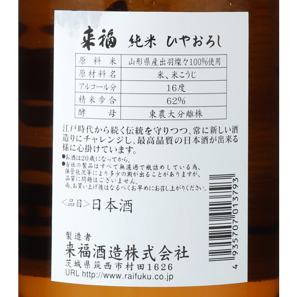 精米も出来る限り自社精米をしており、酵母もほとんどが自社培養しており、いい米が良い麹を造り、いい酵母とミックスされ来福酒造の製品が完成していきます。品質一本、真向勝負を経営理念に、伝統技術を駆使して磨き重ねた商品の数々を、お飲みになるお客様のもとに福が来ますようにと願い造られています。