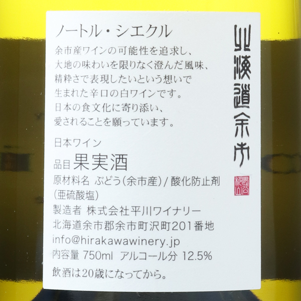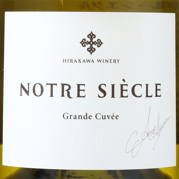 ノートル・シエクルとは、フランス語で「我々の時代」を意味する平川ワイナリーのフラッグシップワインであり、区画の味わいを追求したグランドキュベです。使用品種は公表されていませんが、余市の歴史を築いてきた品種を使用しており、「その品種×この場所は、世界のどの産地にもないエレガントな酒質を有している」と平川さんは言います。豊かな果実味、ボリューム感にミネラル感が調和する白ワインで、アロマ、立体感、美しい酸を有し、世界中でこの区画しか出せない酸の骨格と厚みを追求しています。熟成能力も非常に高く、ワイナリーでは18度でキープして抜栓後、瓶に空気が入った状態で2ヶ月間はおいしい状態が継続したそうです。透明感のある淡いレモンイエロー、照り、輝きあり健全。香りの濃度は高く、凝縮感があり、濃密で複雑です。黄桃、洋梨に、熟した赤リンゴ、ミカン、ピンクグレープフルーツや和柑橘の果皮のアロマ。エーデルフラワー、オレンジの花のニュアンスに、アップルミント、わさび菜、フェンネル、エストラゴンの様なハーブ香が調和し、火打石のニュアンスが感じられます。口当たりには、熟度の高い果実が感じられるしっかりとしたアタック、口いっぱいにじわじわと広がる濃厚なボリューム感があります。ふくよかさの中にエレガントな酸が持続性を持ち、コクがあります。戻り香には、黄色果実やトロピカルフルーツのアロマ、余韻に塩味や厚さを伴いながら長い余韻が持続します。 味わいの密度とともに、酸のレベルがともに高く、存在感のあるワインです。