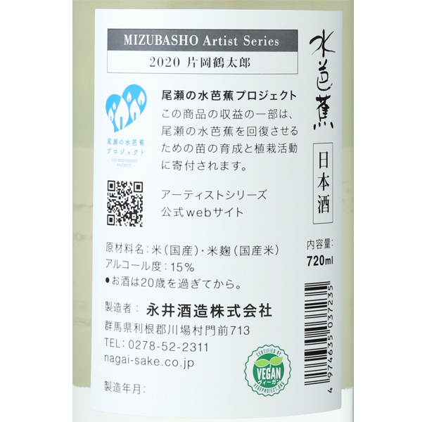 ライチのような甘い口当たり、ほのかにグレープフルーツのフレーバーを感じ、なめらかで軽快な味わいが特徴です。優しい中に幅を持った旨味も広がり、様々な料理と気軽に楽しめる食中酒を目指しました。ラベルの「尾瀬に咲く水芭蕉の花」は片岡鶴太郎氏が描きました。*MIZUBASHO Artist Seriesの売上の一部(5%)は尾瀬の水芭蕉プロジェクトを通じて、尾瀬の自然環境と文化・歴史の再生をサポートする活動に寄付されます。