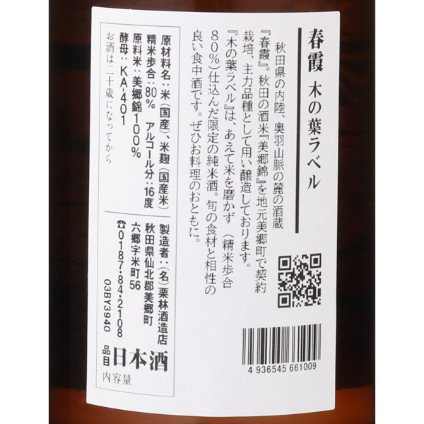 美郷錦の可能性・多様性を表現する 「花」「田んぼ」「わき水」「木の葉」シリーズ。「木の葉」は、あえて米を削らず、精米歩合80%で仕込んだ純米酒です。ラベルにはいちょうの葉が風に舞う木の葉ラベルが描かれています。お米の旨味がぎゅっと凝縮していますので、秋の味覚といっしょにじっくりお楽しみください。蔵紹介