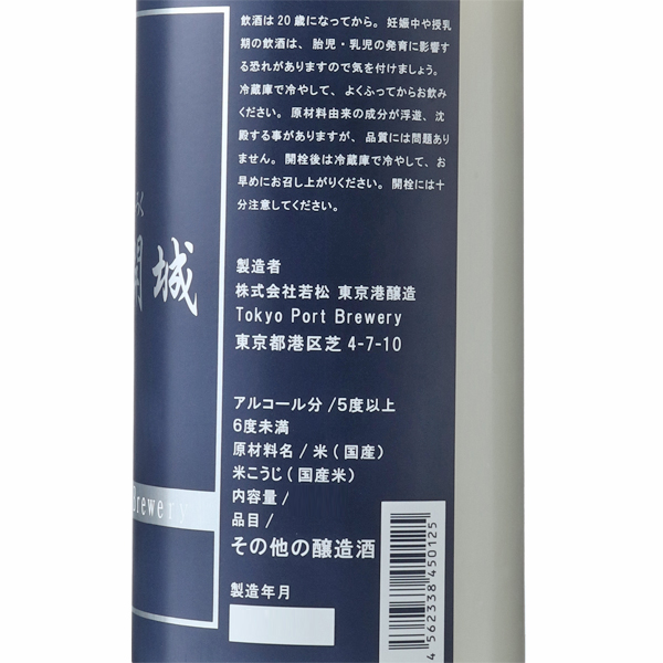 現在の東京都港区に、かつて江戸末期1812年から100年続いた造り酒屋若松屋がありました。約100年前に廃業したその蔵を復活させるべく、7代目・8代目に当たる親子が3年間かけてリキュールとその他の醸造酒の製造免許を取得。そして、醸造技術に定評のある寺澤善実氏を杜氏に招き、東京港醸造の名で再スタートを切りました。当時の若松屋には、江戸城無血開城の立役者である勝海舟や西郷隆盛も訪れていたそうです。100年の時を経て現代に蘇った歴史上の偉人が飲んでいたかもしれない、米・糀・水のみを使用した無添加のどぶろくです。低めのアルコール度数5~6%でどぶろくが始めての方や強いお酒が苦手な方でも美味しくいただけます。甘酒のような味わいが美味しい甘みがあります。