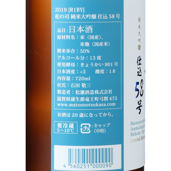 地下120Mの大きな岩盤の下を流れる鈴鹿山系愛知川伏流水を仕込み水とし、100%契約栽培により栽培法を定め十分に審査された酒米を、蔵人が時間をかけて精米。酒に味わいをつける箱麹法による麹造りや、酒質を決める社内保存酵母菌による速醸酒母と、昔ながらの生もと酒母の採用。また、発酵温度を低温に抑えながらも完全発酵を目指す小仕込み(1.2t以下)によるモロミ工程、そして瓶詰貯蔵による低温熟成管理(5℃以下)など、永年の経験による出来る限り丁寧な手造りで、深遠な味わいの「松の司」を醸しだします。(松瀬酒造HPより)