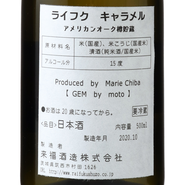 蔵元とGEM by moto 千葉麻里絵さんとのコラボ商品。お菓子の包みのような可愛らしい包み紙。3年寝かした来福mellow(貴醸酒)をアメリカンオーク樽にて貯蔵。口の中でとろけるキャラメルチョコレートのようなトキメク味わい。まさにデザート感覚のお酒となっております。