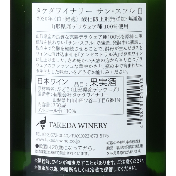 山形県上山市の協力農家が造った完熟デラウェア種100%使用。山形で栽培の盛んなデラウェア種、しっかり栽培・醸造したものには華やかな香りと奥行きがあります。亜硫酸を使用しない「サン・スフル」で醸造を行い、アンセストラル法により発泡ワインに仕上げました。アンセストラル法とは、発酵中のワインを瓶詰し、瓶の中で発酵を継続させることで、酵母が生んだガスがワインに溶け込み発泡ワインになることです。酵母が生んだきめ細やかな泡が、デラウェアのフレッシュな香りをますます引き立てています。また、ろ過をしないで瓶詰めすることでぶどう由来のにごりが残り、それが格別な風味となっています。酸化防止剤を使用せず、ろ過も行わない素直な味わいと、1本1本それぞれの瓶の中で育まれた、生き生きとした味わいをどうぞお楽しみください。蔵紹介