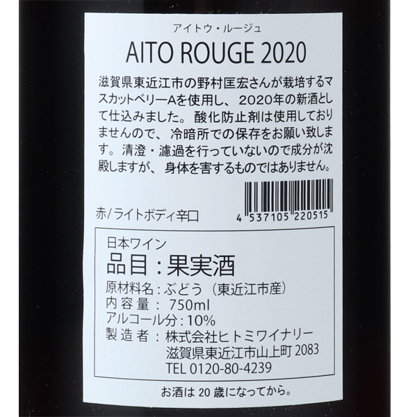 2020年は非常に降雨の多い6,7月でしたが、その長雨にも負けずしっかりと糖を蓄えたブドウを収穫してもらうことが出来ました。仕込みはマセラシオンカルボニックという方法で仕込みました。仕込みから約3週間後にプレスを行い、静置後にオリ引きを1度行った後、11月6日に瓶詰めを行いました。 2020年の新酒としてリリースするワインです。瓶詰めからすぐのリリースのため、今後の味わいの経時変化を楽しんで頂ければ幸いです。