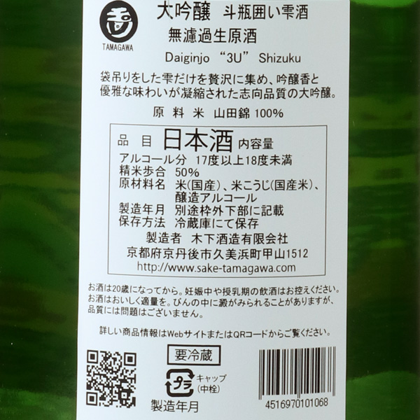 時間の経過や温度の違いで変化を楽しむことができる日本酒「玉川」木下酒造は天保13年、1842年に京丹後久美浜の地で創業しました。蔵のすぐ隣に川上谷川という川があり、玉(とてもきれいな)のような川というところから、玉川と命名されました。杜氏を務めるイギリス人のフィリップ・ハーパー氏は、家付き酵母を使った自然仕込の山廃や、江戸時代の製法を再現した酒など、挑戦的な酒造りで新たなファン層をつくりだしています。時間軸と温度の違いによる味の変化は、日本酒の最大の魅力だという考えから、しぼりたての無濾過生原酒から蔵で熟成させた古酒も多く販売しています。