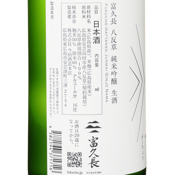 富久長が独自に復活栽培した広島八反系酒米のルーツ「八反草」の純米吟醸酒。旨みたっぷりなのに見事なまでにスカッと切れるあと口のよさは八反草というお米ならでは。この時期限定の直汲みですので、うっすらとおりのある少しガス感も感じられる仕上がりとなっています。蔵紹介