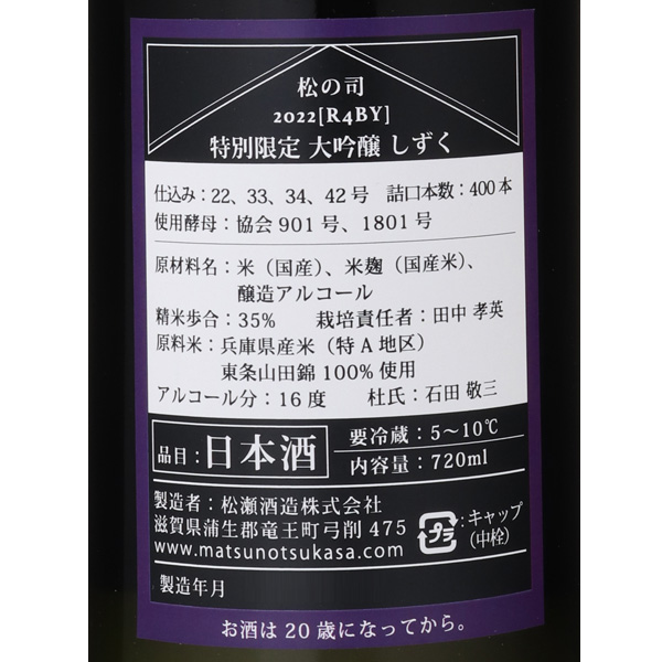 地下120Mの大きな岩盤の下を流れる鈴鹿山系愛知川伏流水を仕込み水とし、100%契約栽培により栽培法を定め十分に審査された酒米を、蔵人が時間をかけて精米。酒に味わいをつける箱麹法による麹造りや、酒質を決める社内保存酵母菌による速醸酒母と、昔ながらの生もと酒母の採用。また、発酵温度を低温に抑えながらも完全発酵を目指す小仕込み(1.2t以下)によるモロミ工程、そして瓶詰貯蔵による低温熟成管理(5℃以下)など、永年の経験による出来る限り丁寧な手造りで、深遠な味わいの「松の司」を醸しだします。(松瀬酒造HPより)