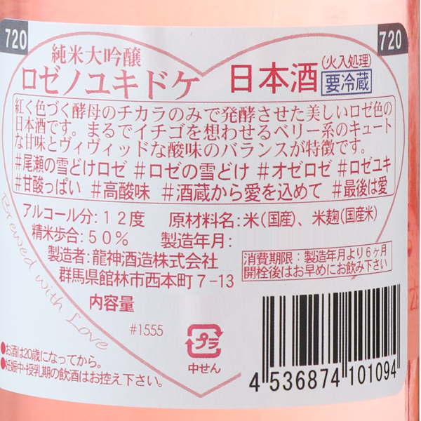 赤色酵母で仕込んだ醪をしぼった、ロゼ色の日本酒です。イチゴのようなキュートな甘味と、ワインを想わせるヴィヴィットな酸味が特徴。ラベルは中身が見えるシースルー仕様!ロゼ色のハートを飲み尽くしてください。蔵紹介