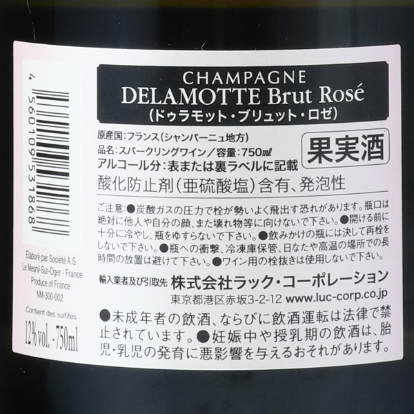 品種やクリュ、長期熟成など当然ながらサロンとの近似性が見られ、メニル、アヴィーズ、オジェ、クラマンのシャルドネがアッサンブラージュされたブラン・ド・ブラン・ミレジメに至っては、プチ・サロンと呼んでしまいたくなるほどの気品と複雑味が堪能できます。洗練されたスタイルをもつドゥラモットは、食前はもちろん、昨今の素材を重視したフランス料理や伝統的な日本料理とともに、十分食中酒として楽しめるシャンパーニュです。