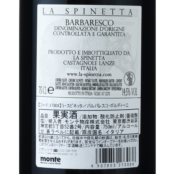 スピネッタのフラッグシップである三兄弟「ガッリーナ」「ヴァレイラーノ」「スタルデリ」に比べ、この「ボルディーニ」はまだお手頃価格。それは三兄弟に比べて樹齢が若いから。とはいえ樹齢は”35年以上”。すでに王の風格があり、完熟フルーツのような香りと凝縮感のあるボディ、力強い余韻がしっかりと感じられます。バラやスミレ、ラズベリー、ミントなどフローラルでフルーティなアロマ。タンニンがあり、驚くほどエレガント。とても楽しめるバルバレスコです。ネイヴェにあるボルディーニ畑のネッビオーロから造られています。