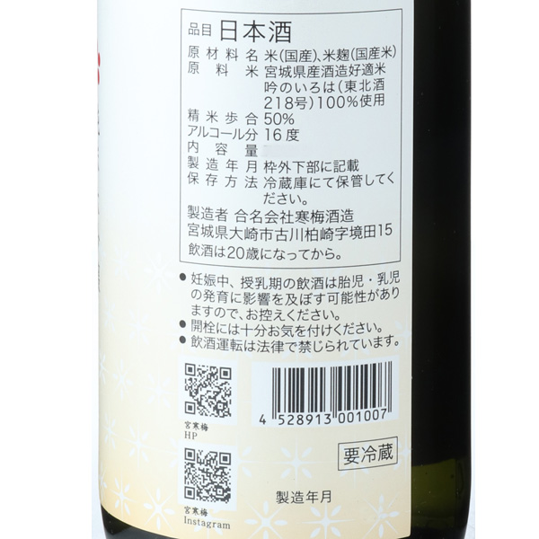 たった一杯でたっぷり贅沢したような明るい気持ちになれる酒。大正7年、1918年創業。ササニシキやひとめぼれなどのブランド米の産地として有名な、宮城県大崎市の古川柏崎字境田に蔵はあります。創業者の岩崎碩次郎は遊び心を大切にしてお酒を造っていたそうです。それに習い、現在も遊び心を忘れず、ほがらかな明るい気持ちがお酒に伝わるよう、日々醸造しています。お米は自社栽培したものを使用し、田んぼから酒造りを始めます。自社栽培米以外も使用しますが、全て宮城県内のものにこだわり、地元を大切にしています。心やすらぐ春のような、優しい味わいのお酒をご堪能ください。
