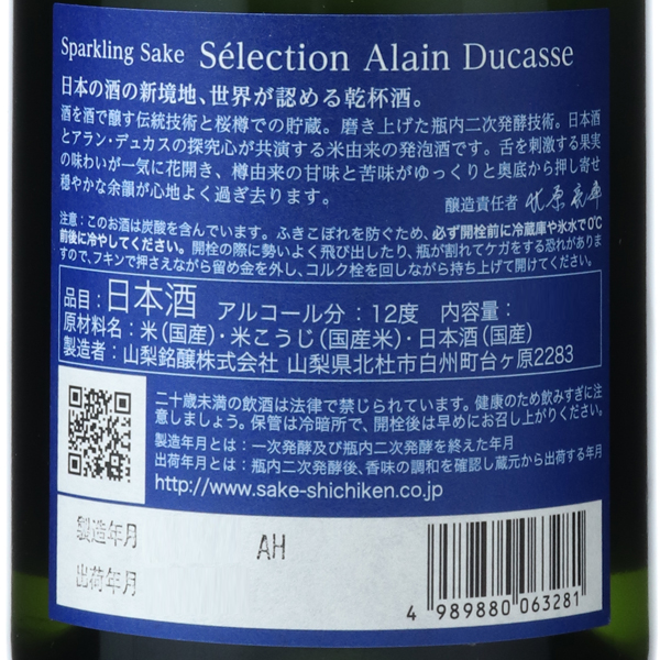 フレンチの巨匠アラン・デュカス氏とのコラボレーションのスパークリング商品。酒を酒で醸す伝統技術と桜樽での貯蔵。磨き上げた瓶内二次発酵技術。日本酒とアラン・デュカス氏の探究心が共演する米由来の発泡酒です。舌を刺激する果実の味わいが一気に花開き、樽由来の甘味と苦味がゆっくりと奥底から押し寄せ穏やかな余韻が心地よく過ぎ去ります。注意事項