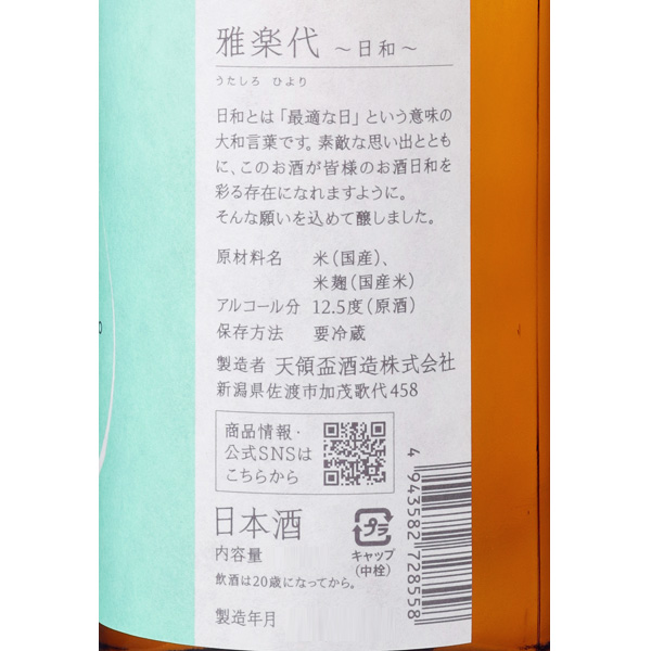 今回の日和は、「より雅楽代らしく」、淡麗で軽やか、綺麗なお酒に仕上がる様に追求しました。低アルコールですが膨らみがあって、尚且つ低アルコールらしい軽やかさを兼ね備えているお酒です。香りは控えめながら、口に含むと軽く、ほんのりとした甘みがゆっくりと広がっていきます。喉を通る時も抵抗なく、ストンと落ちていくような、ふっと消えていくような儚さを伴う後味に仕上がりました。ワイングラスの様なスラッとしたグラスで、素材の味わいを活かしたお料理と共にお召し上がりください。#はせがわ酒店スタッフの、私これ買いました!