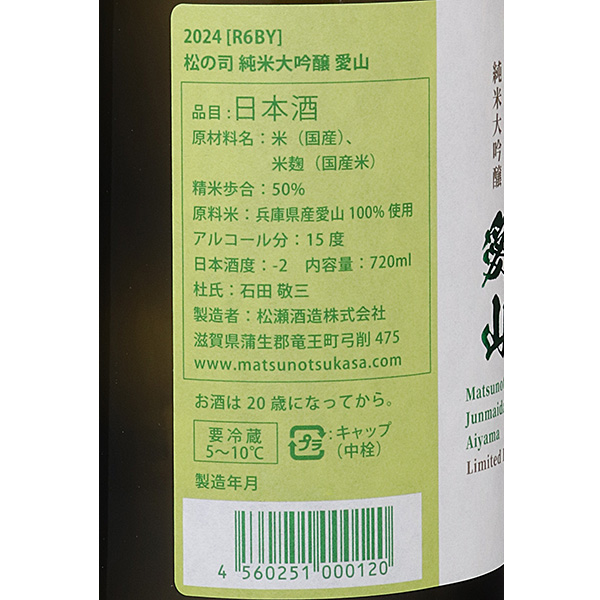 地下120Mの大きな岩盤の下を流れる鈴鹿山系愛知川伏流水を仕込み水とし、100%契約栽培により栽培法を定め十分に審査された酒米を、蔵人が時間をかけて精米。酒に味わいをつける箱麹法による麹造りや、酒質を決める社内保存酵母菌による速醸酒母と、昔ながらの生もと酒母の採用。また、発酵温度を低温に抑えながらも完全発酵を目指す小仕込み(1.2t以下)によるモロミ工程、そして瓶詰貯蔵による低温熟成管理(5℃以下)など、永年の経験による出来る限り丁寧な手造りで、深遠な味わいの「松の司」を醸しだします。(松瀬酒造HPより)