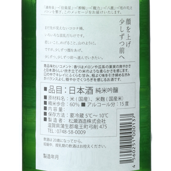 蔵元から蔵元へリレー形式でバトンを繋ぎ、ラベルに込められたメッセージをお届けします。1日も早くこの事態が終息し、笑顔で乾杯できる日が来るよう想いの詰まった1本。桝田酒造店「満寿泉」から始まったバトンは、宮城県「伯楽星」→高知県「酔鯨」→兵庫県「龍力」→大分県「八鹿」→「松の司」につながりました。