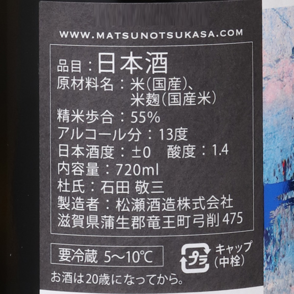 地下120Mの大きな岩盤の下を流れる鈴鹿山系愛知川伏流水を仕込み水とし、100%契約栽培により栽培法を定め十分に審査された酒米を、蔵人が時間をかけて精米。酒に味わいをつける箱麹法による麹造りや、酒質を決める社内保存酵母菌による速醸酒母と、昔ながらの生もと酒母の採用。また、発酵温度を低温に抑えながらも完全発酵を目指す小仕込み(1.2t以下)によるモロミ工程、そして瓶詰貯蔵による低温熟成管理(5℃以下)など、永年の経験による出来る限り丁寧な手造りで、深遠な味わいの「松の司」を醸しだします。(松瀬酒造HPより)