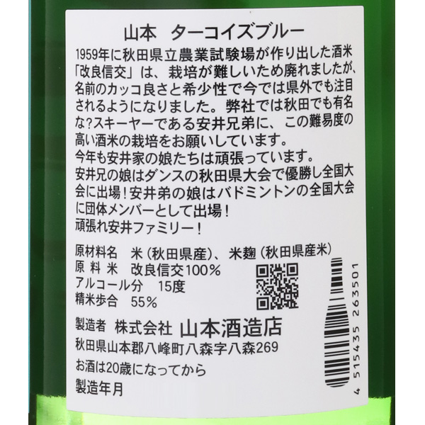 秋田県で酒米用品種として初めて採用された改良信交。信交190号(たかね錦)からの選抜で、原品種より早生で心白が出やすく、醸造特性も良いとされていましたが、その収穫の難しさもあってか減少の一途を辿り、現在では稀少な酒米となっております。そんな稀少な酒米で仕込まれ、パワーストーンで"邪気を払い、幸運を呼び寄せる"意味を持つターコイズが名付けられました。爽やかな果実味と芳醇な旨味がきれいに広がります。蔵紹介