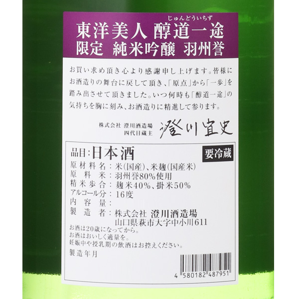 酒米違いでリリースしている「醇道一途」シリーズ。この言葉は何があろうと今もこれからも酒造り一筋に生きていきなさい。と社長兼杜氏の澄川宜史氏が、初めて教えを請うた、灘の銘杜氏の米田杜氏に頂いた言葉です。羽州誉は山形県の高木酒造様が育成された酒米で、お米の味わいの出易い特徴を持っており、東洋美人の華やかでフルーティーさを加え、キレの良さと爽やかな香りを感じて頂けるお酒に仕上がっています。
